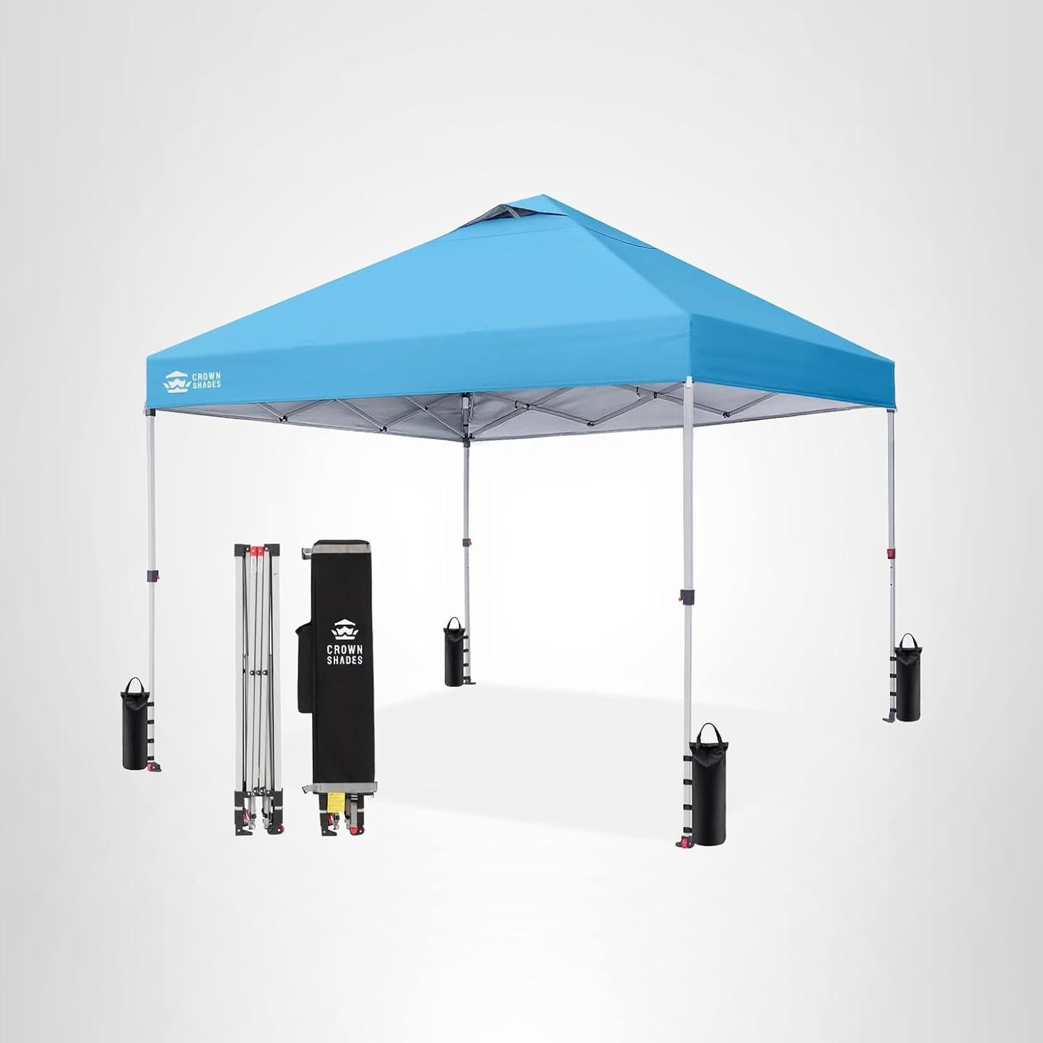 CROWN SHADES 10x10 Pop Up Canopy - Beach Tent with One Push Setup - Easy Outdoor Sun Shade for Events, Parties, Camping - Gazebo with STO-N-Go Cover Bag, Silver Coated Top, Red Strips(Sky Blue)