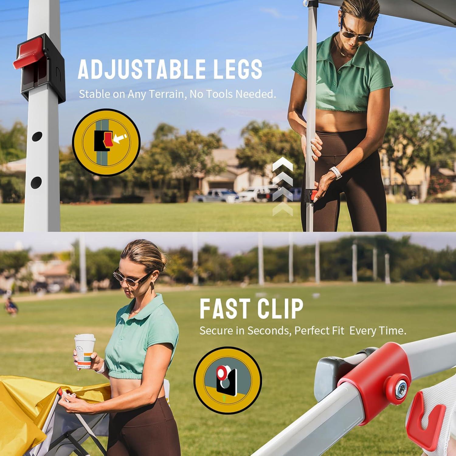 ONE BUTTON EASY SET UP – Our 10×10 pop up canopy tent features patented one push center lock tech. With just a single push, the central hub locks the poles in place. Designed for the next generation, this outdoor canopy for patio can be set up by two people in seconds without any tools. Three adjustable height settings with soft, pinch-free buttons ensure convenience and safety, making it perfect for camping, beach outings, craft fairs, tailgating, farmer markets, outdoor BBQs, and more