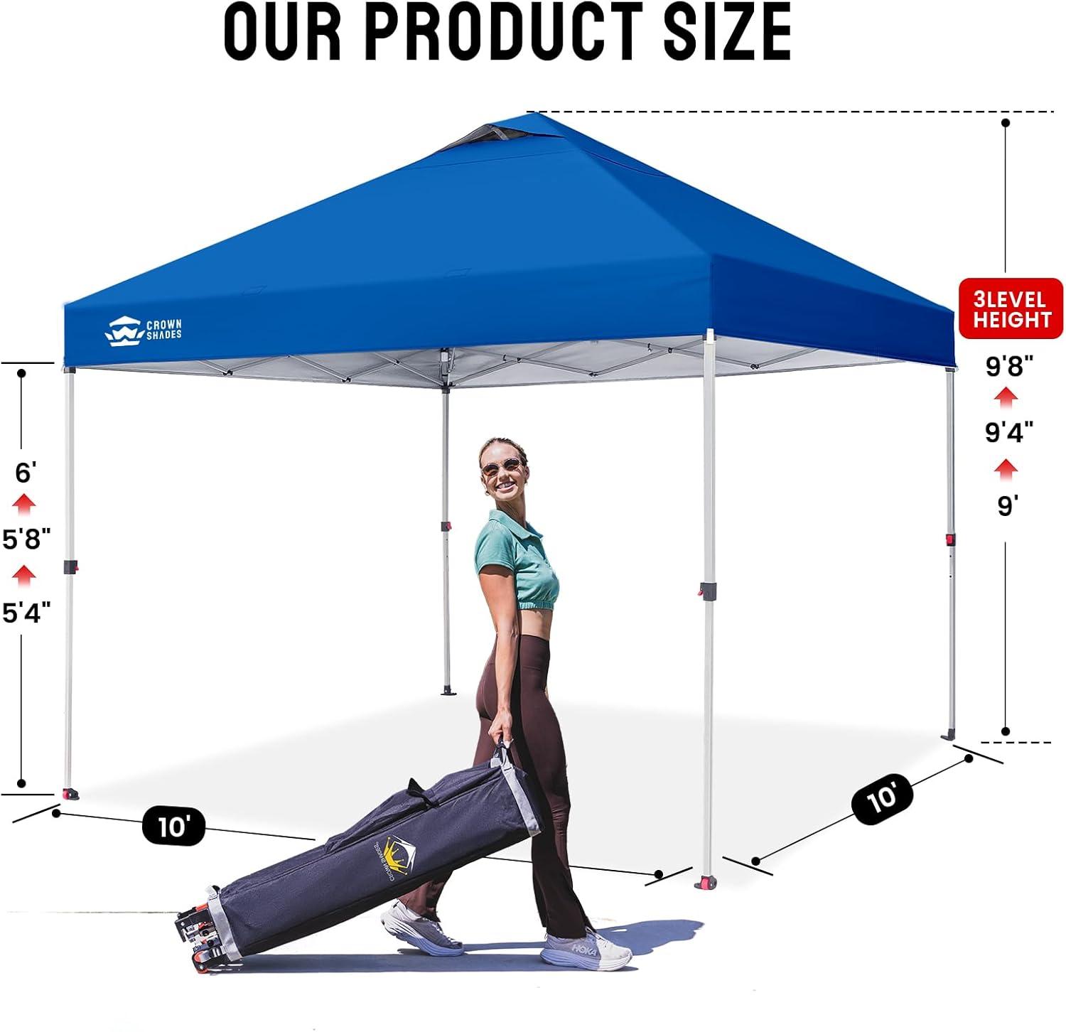 ONE BUTTON EASY SET UP – Our 10×10 pop up canopy tent features patented one push center lock tech. With just a single push, the central hub locks the poles in place. Designed for the next generation, this outdoor canopy for patio can be set up by two people in seconds without any tools. Three adjustable height settings with soft, pinch-free buttons ensure convenience and safety, making it perfect for camping, beach outings, craft fairs, tailgating, farmer markets, outdoor BBQs, and more