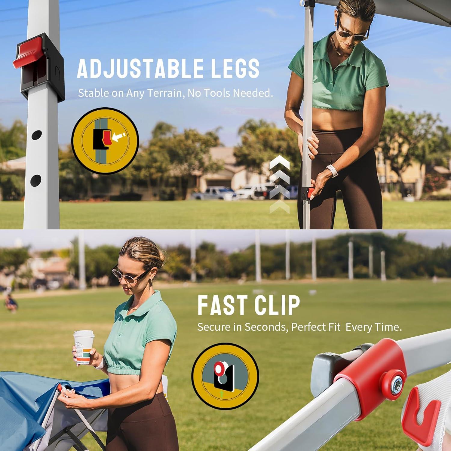 ONE BUTTON EASY SET UP – Our 10×10 pop up canopy tent features patented one push center lock tech. With just a single push, the central hub locks the poles in place. Designed for the next generation, this outdoor canopy for patio can be set up by two people in seconds without any tools. Three adjustable height settings with soft, pinch-free buttons ensure convenience and safety, making it perfect for camping, beach outings, craft fairs, tailgating, farmer markets, outdoor BBQs, and more