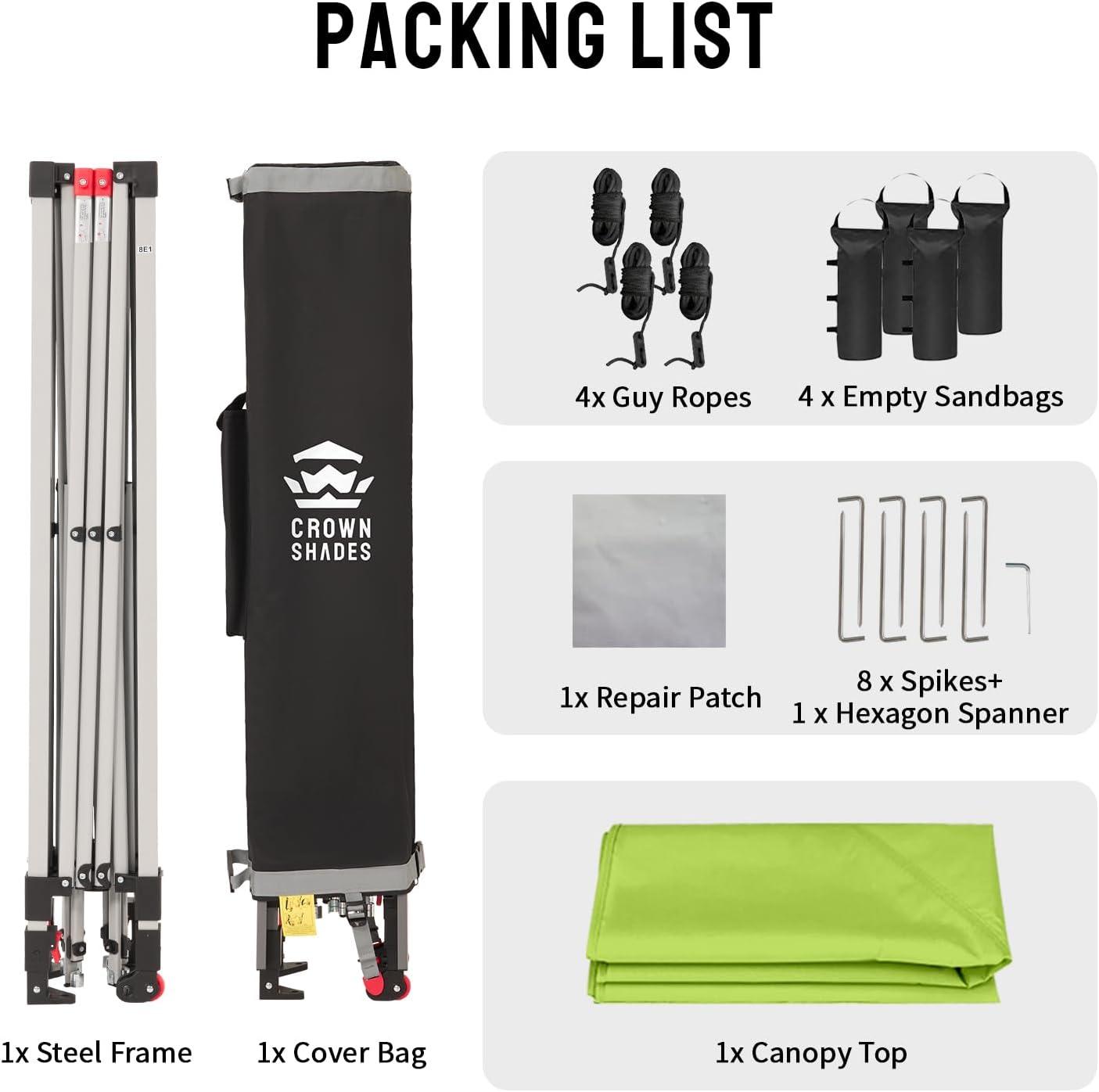 STO’ N GO SYSTEM – Our lift-free system makes collapsing, storing, and transporting the 10×10 tent a breeze. The 10×10 popup canopy can be stored with the fabric attached, with a specialized pocket for 4 sandbags, 8 stakes, and 4 guy ropes. Integrated wheels in the feet allow easy movement even when the instant shelter tent is set up, by simply lifting the side without wheels. This feature is especially useful for quick setup and takedown at locations like the patio or sports events