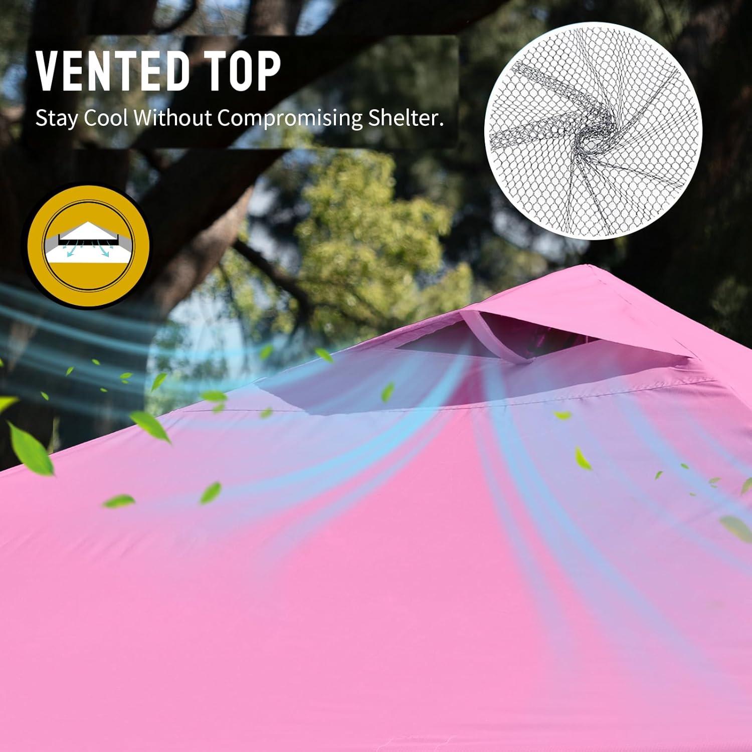 HIGH GRADE STEEL FRAME – The durable, high-grade, corrosion-resistant steel truss frame with hardened through bolts comes pre-assembled and can be set up without any tools. Engineered to support up to 120 lbs. distributed across the frame, it ensures robust and reliable performance. The extended ceiling assembly and upgraded high peak design make it easier for rainwater to run off, preventing water pooling on the canopy. Perfect for extended outdoor use at markets, festivals, and exhibitions