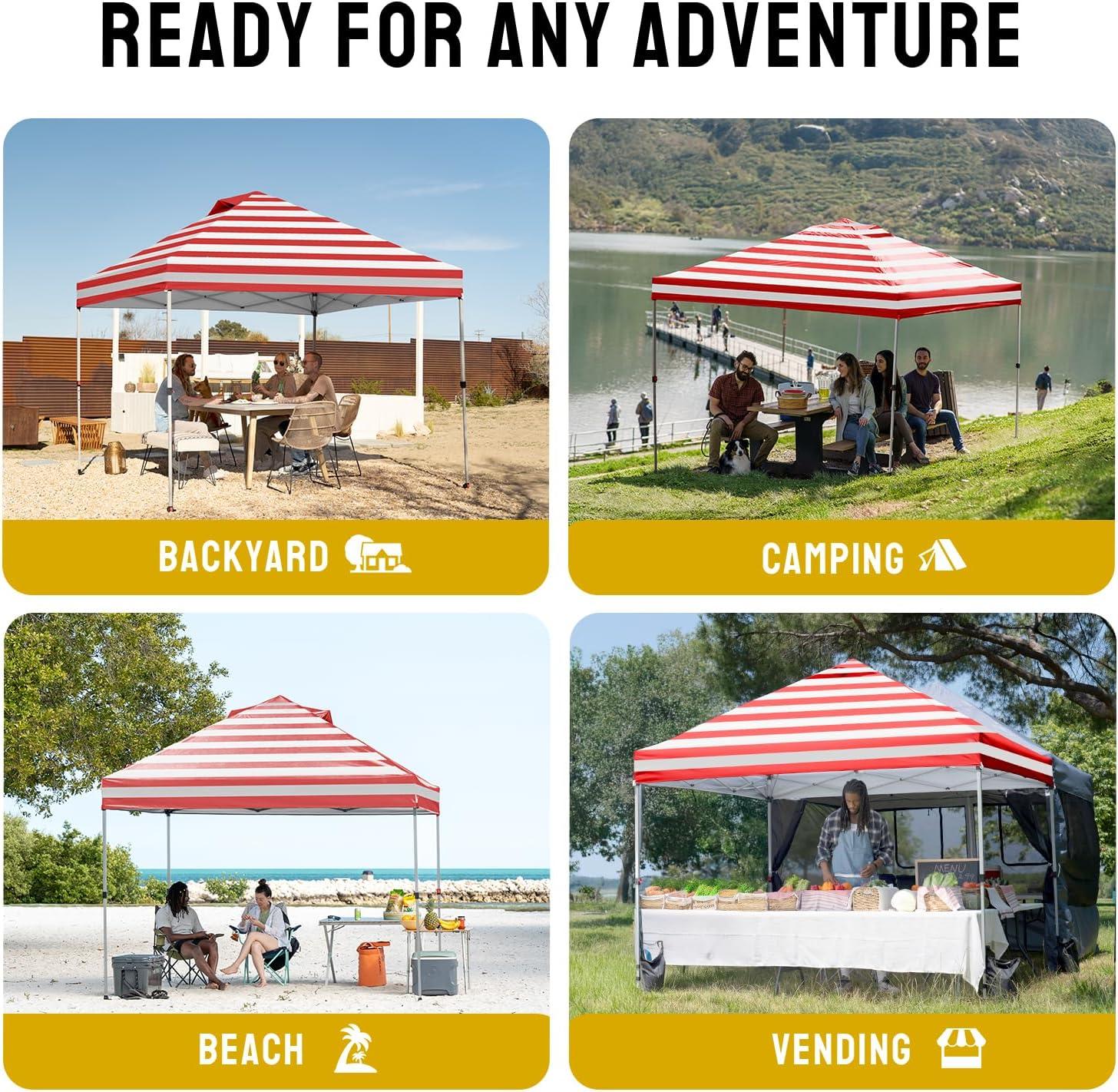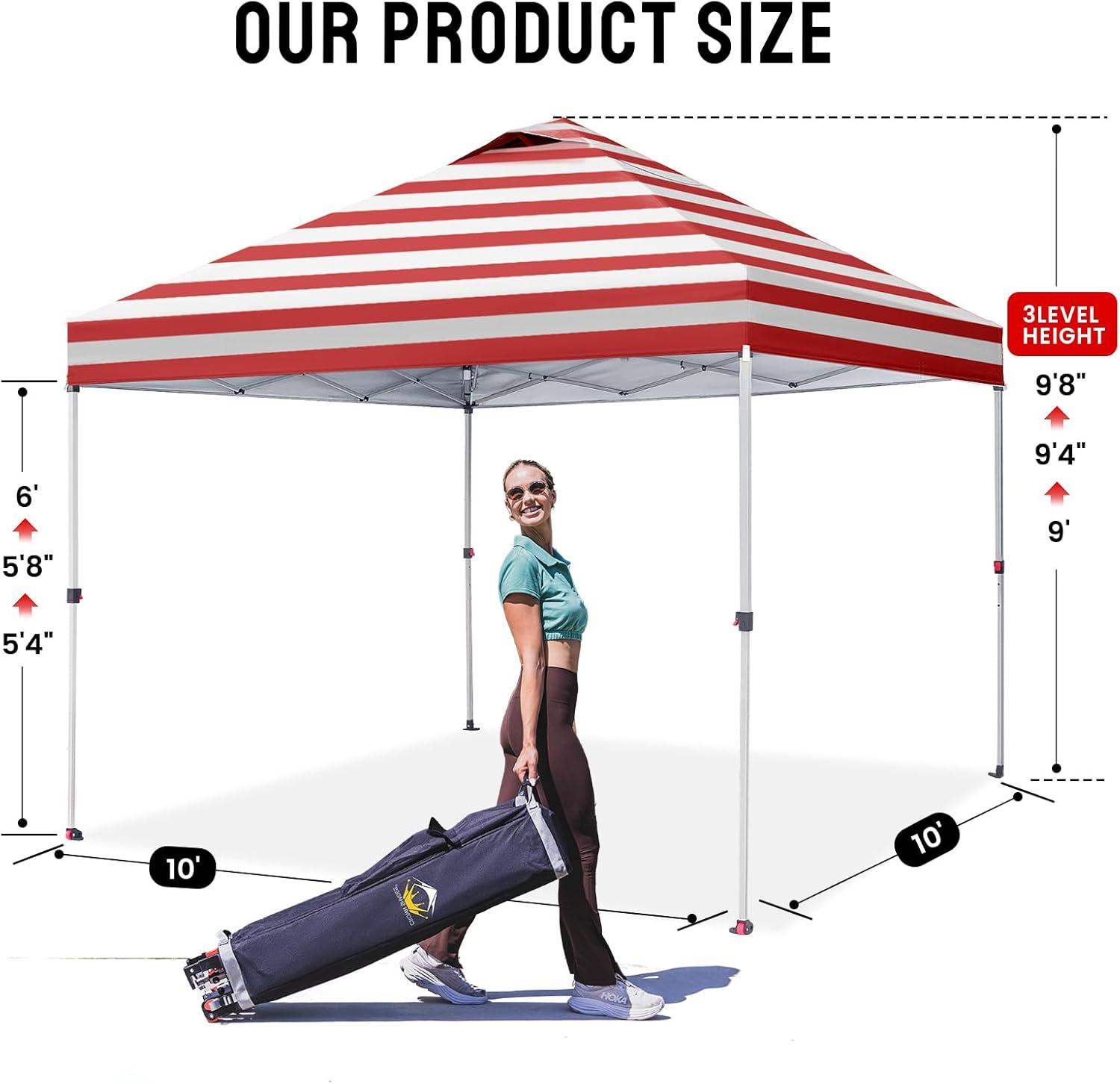 ONE BUTTON EASY SET UP – Our 10×10 pop up canopy tent features patented one push center lock tech. With just a single push, the central hub locks the poles in place. Designed for the next generation, this outdoor canopy for patio can be set up by two people in seconds without any tools. Three adjustable height settings with soft, pinch-free buttons ensure convenience and safety, making it perfect for camping, beach outings, craft fairs, tailgating, farmer markets, outdoor BBQs, and more