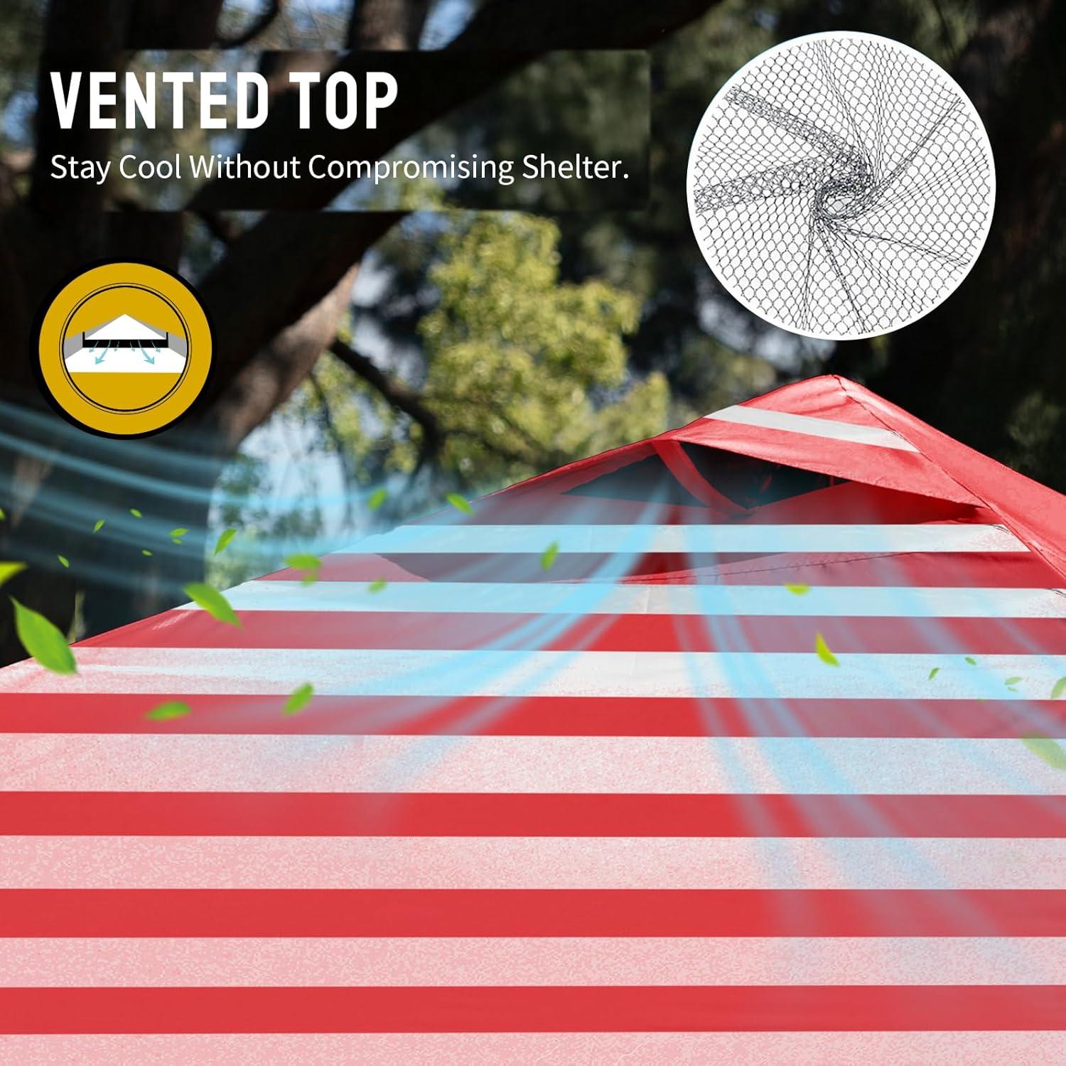 HIGH GRADE STEEL FRAME – The durable, high-grade, corrosion-resistant steel truss frame with hardened through bolts comes pre-assembled and can be set up without any tools. Engineered to support up to 120 lbs. distributed across the frame, it ensures robust and reliable performance. The extended ceiling assembly and upgraded high peak design make it easier for rainwater to run off, preventing water pooling on the canopy. Perfect for extended outdoor use at markets, festivals, and exhibitions