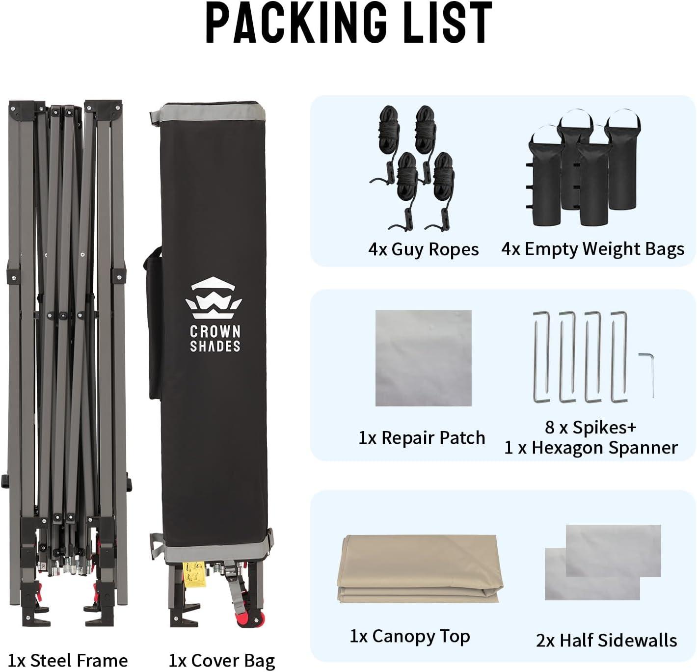 [UPGRADE FABRIC]: Rugged 150D Silver coated canopy fabric provides UPF 50+ UV protection. The CPAI-84 rated flame resistant fabric is water repellant and includes waterproof sealing tape to protect against water pooling in wet conditions.The color of the tent 10×10 will look greyish due to the silver coating.
