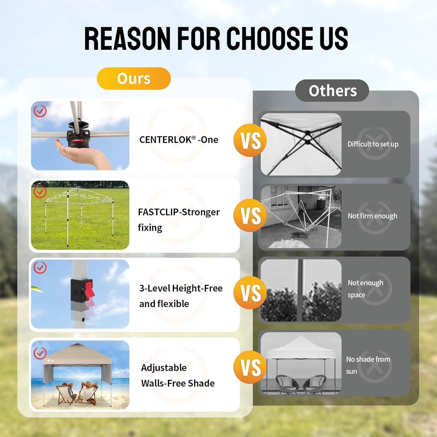[EASIEST SET UP]: Patented one push center lock technology – central hub locks out all four legs with a single push. Then use the soft pinch-free buttons to set the leg height. The new generation canopy designed so two people can set it up in seconds with no tools necessary.