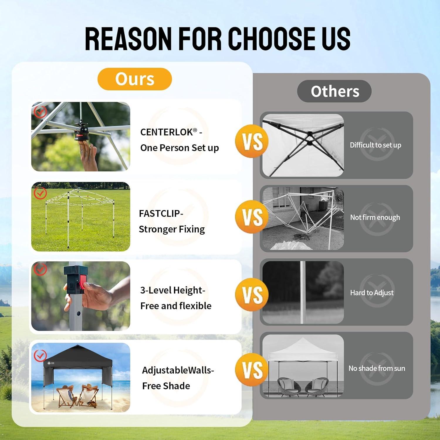 [EASIEST SET UP]: Patented one push center lock technology – central hub locks out all four legs with a single push. Then use the soft pinch-free buttons to set the leg height. The new generation canopy designed so two people can set it up in seconds with no tools necessary.
