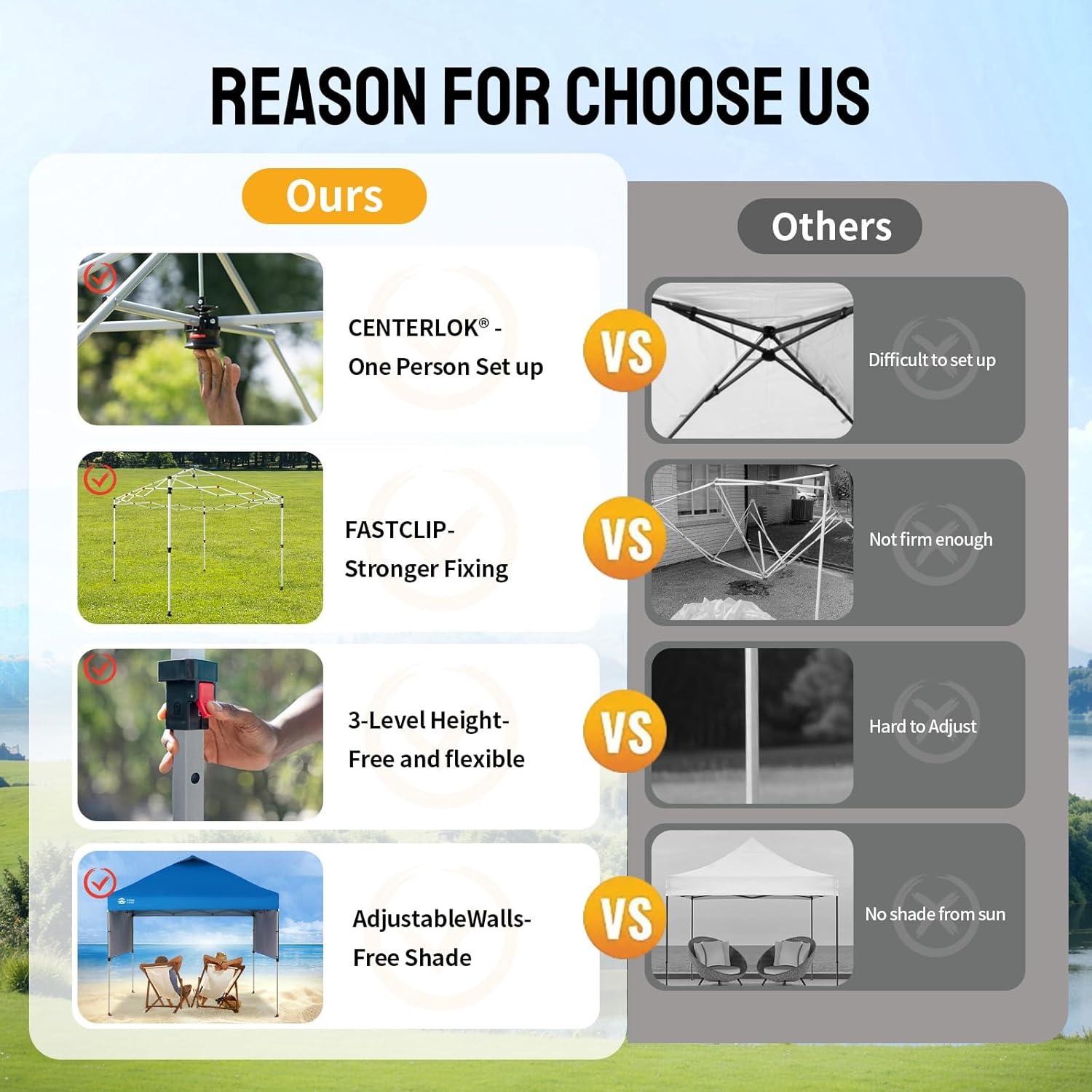 [EASIEST SET UP]: Patented one push center lock technology – central hub locks out all four legs with a single push. Then use the soft pinch-free buttons to set the leg height. The new generation canopy designed so two people can set it up in seconds with no tools necessary.