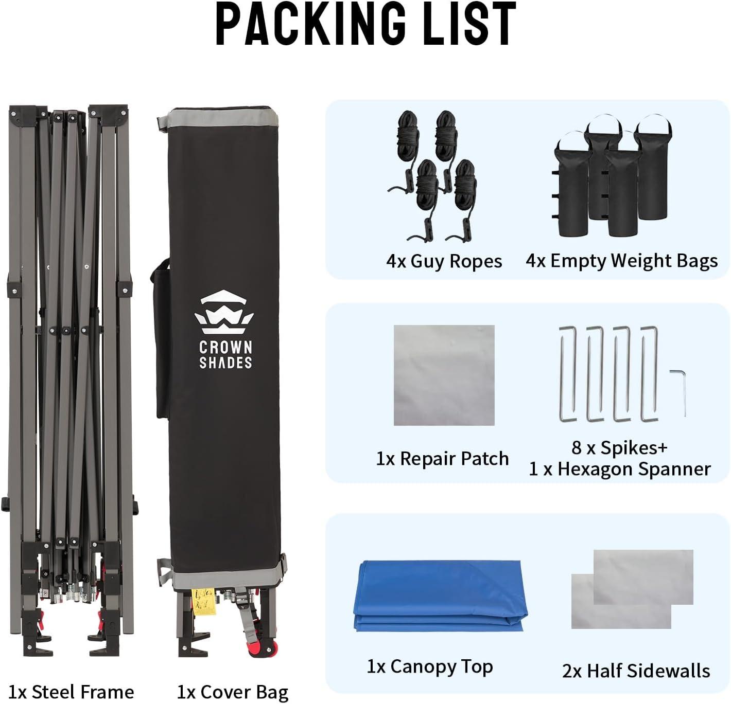 CROWN SHADES 10x10 Pop up Canopy Tent Instant Canopy with 150D Silver Coated Fabric Including 2 Half Sidewalls, 4 Ropes, 8 Stakes, 4 Weight Bags, STO 'N Go Bag, White(Blue)