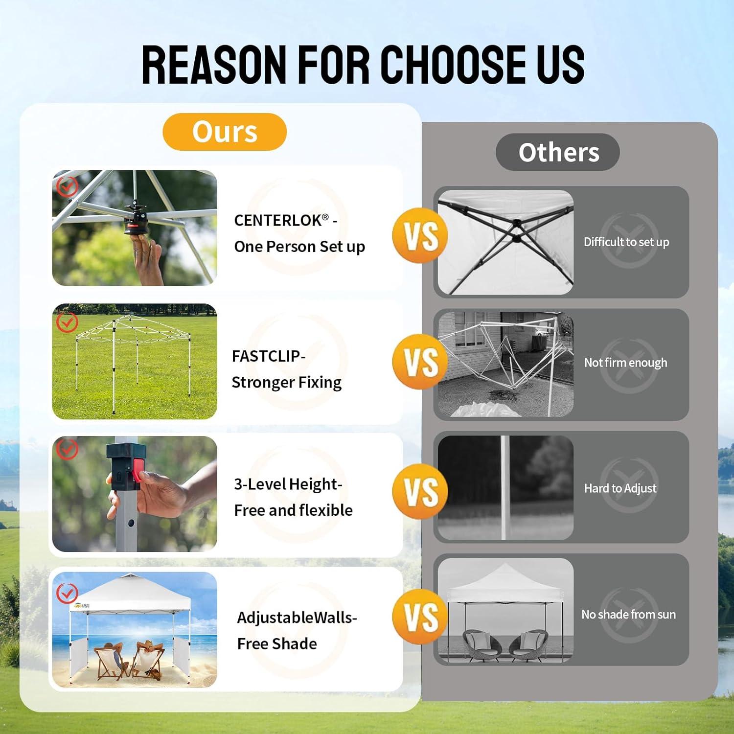 [EASIEST SET UP]: Patented one push center lock technology – central hub locks out all four legs with a single push. Then use the soft pinch-free buttons to set the leg height. The new generation canopy designed so two people can set it up in seconds with no tools necessary.